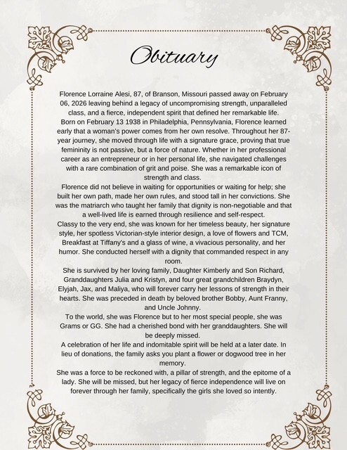Florence Lorraine Alesi, 87, of Branson, Missouri passed away on February 06, 2026 leaving behind a legacy of uncompromising strength, unparalleled class, and a fierce, independent spirit that defined her remarkable life. Born on February 13 1938 in Philadelphia, Pennsylvania, Florence learned early that a woman's power comes from her own resolve. Throughout her 87-year journey, she moved through life with a signature grace, proving that true femininity is not passive, but a force of nature. Whether in her professional career as an entrepreneur or in her personal life, she navigated challenges with a rare combination of grit and poise. She was a remarkable icon of strength and class.